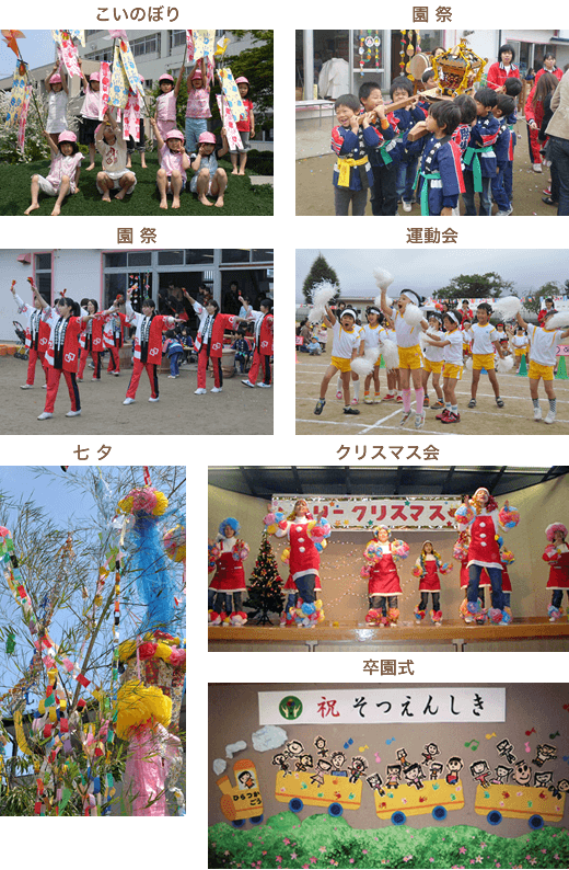 【 春 】入園式 親子行事(親子ラリー大会、陶芸教室) 畑づくり 【 夏 】夏祭り お泊まり保育 プール 【 秋 】運動会 園祭 お月見会 祖父母参観 和太鼓披露(年3回) 【 冬 】クリスマス会 保育参観 だんご木作り 鏡開き(たったらもち) 一升もち ひなまつり会 卒園式