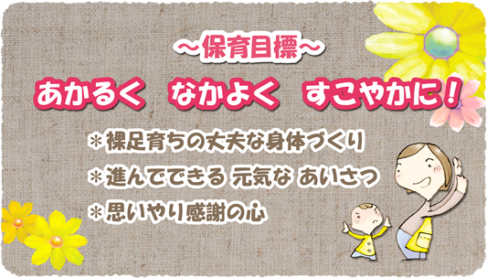 | 保育時間 | : | 7:00〜18:00 18:00〜19:15(延長保育) 土曜日 7:00〜18:00 |